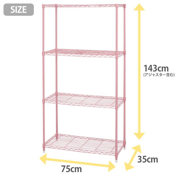 お部屋にスッキリ配置できるアジャスター仕様!●商品サイズ(約):幅75×奥行35×高さ143cm(アジャスター取付時)●重量:約9.6kg●可動棚板:4枚●ポール径:約19mm●耐荷重 棚板1枚あたり:約50kg 全体:約100kg●材質 棚板・ポール:スチール(粉体塗装) 棚板固定部分:ABS樹脂 スリーブ:ポリプロピレン●カラー:ホワイト、ブラック、ピンク、パープル、グリーン、ブラウン★