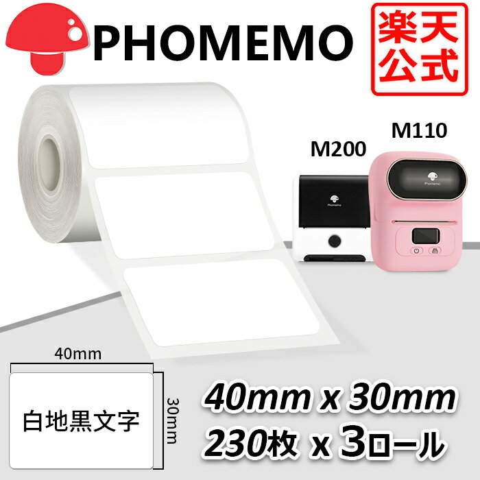 P8倍!ラベルライター Phomemoフォメモ M110 M200用紙 ラベルプリンター用紙 40 x 30(230枚)/3巻セット プレカットラベル 白地に黒文字 配送宛名ラベル 感熱ロール 接着剤ある 剥離紙 食品表示/値札/バーコード ポイント消化【公式